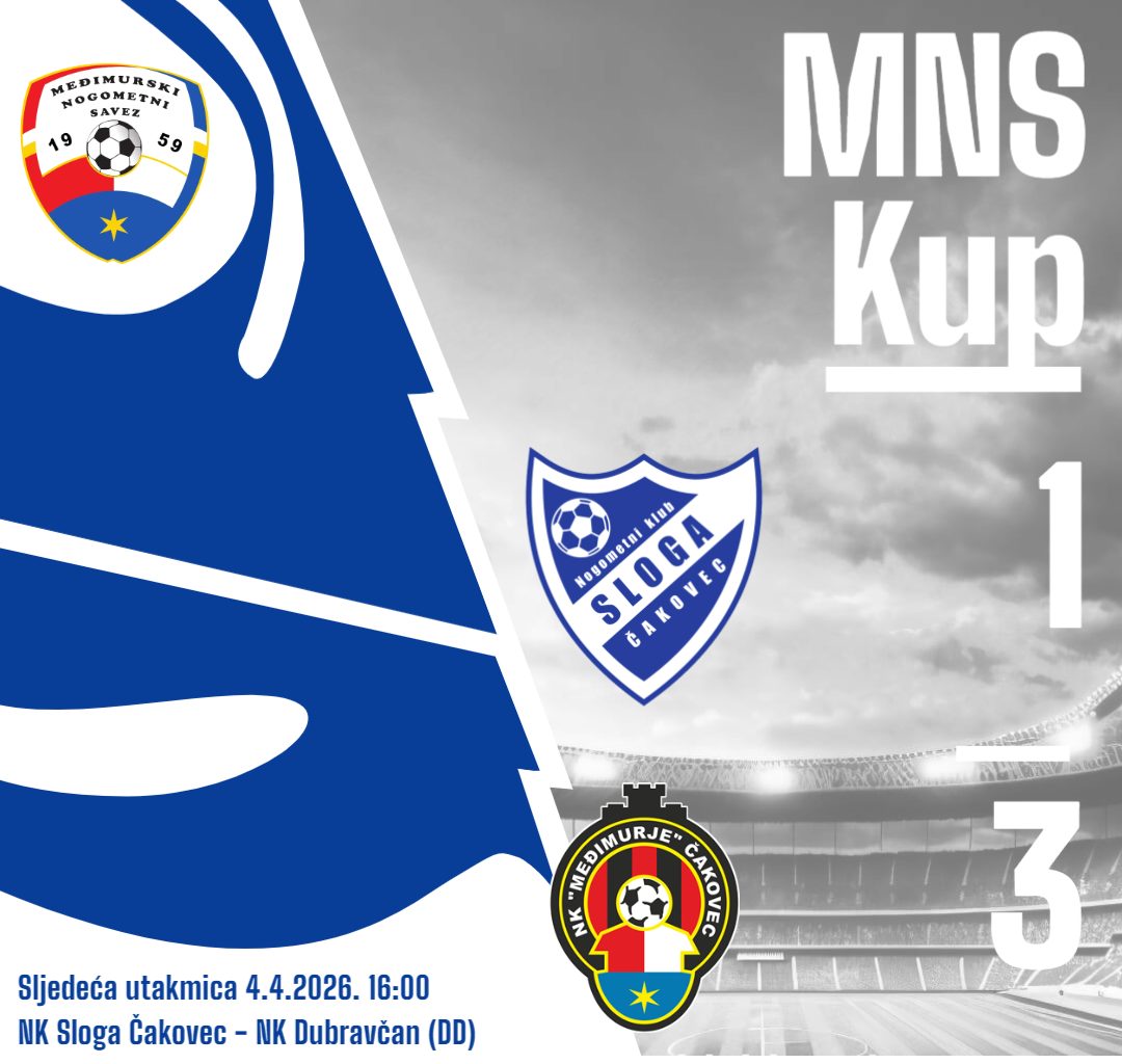Nogometaši NK Sloga Čakovec oprostili su se od ovogodišnjeg izdanja Kupa MNS u četvrtfinalu, gdje je u gradskom derbiju bolja bila ekipa NK Međimurje, koja je slavila rezultatom 1:3. Susret je odigran 1. travnja 2026. na stadionu Sloge pred oko 300 gledatelja.